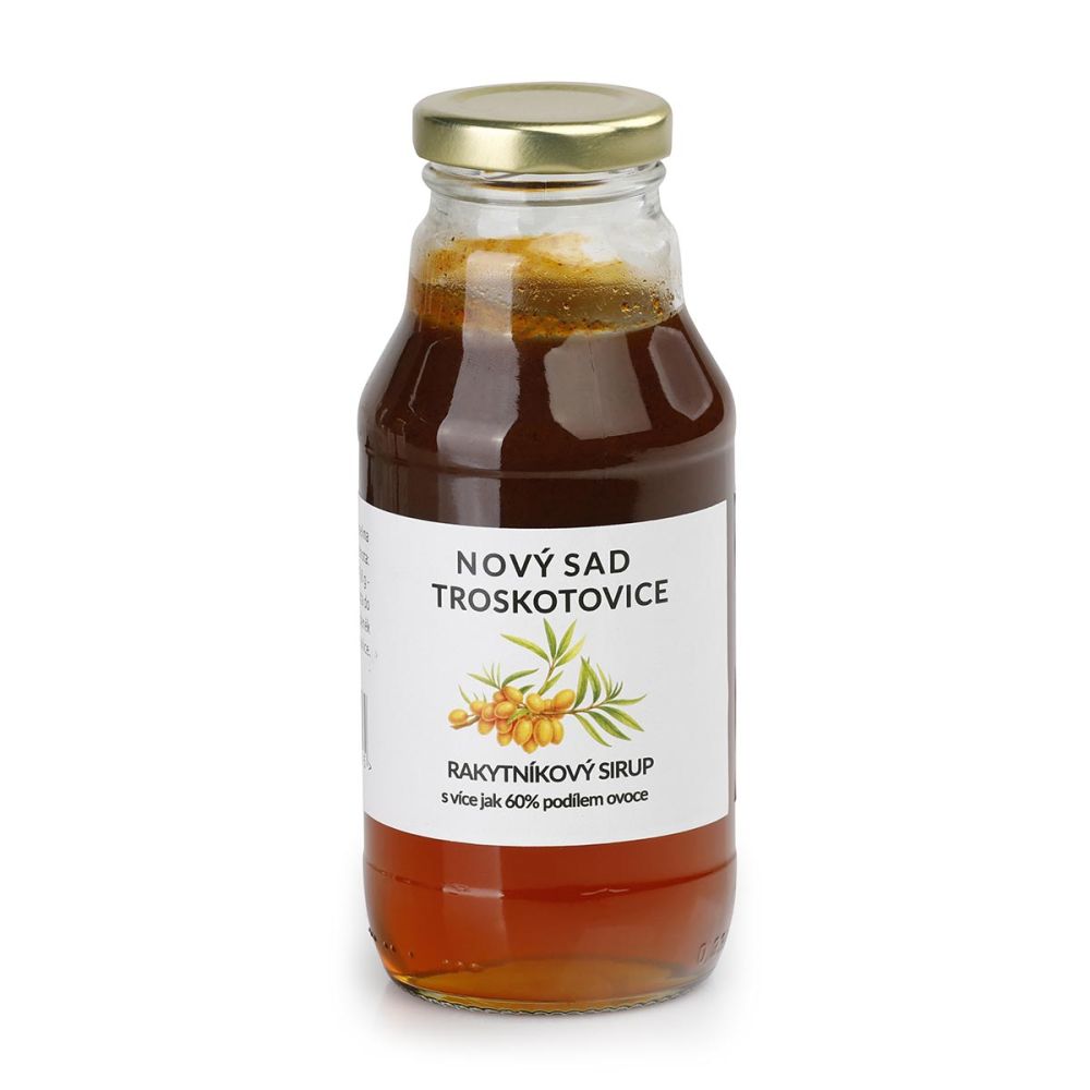 Rakytníkový sirup, vyrobený s láskou a péčí, obsahuje 60 % ovocné složky a je vyroben z rakytníku z našeho sadu.